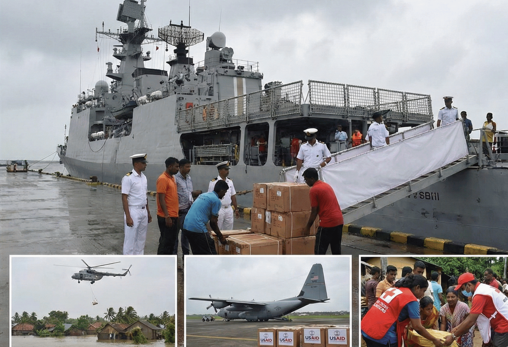 - ஐ.என்.எஸ் விக்ராந்த் & ஐ.என்.எஸ் உதயகிரி: இந்தியாவின் விமானம் தாங்கிக் கப்பலான ஐ.என்.எஸ் விக்ராந்த் (INS Vikrant) மற்றும் ஐ.என்.எஸ் உதயகிரி (INS Udaigiri) ஆகியவை, ஏற்கனவே சர்வதேச கடற்படை ஆய்வு (International Fleet Review) நிகழ்வுக்காகக் கொழும்பு துறைமுகத்தில் இருந்தன. பேரிடர் அறிவிக்கப்பட்டவுடன், இந்த இரு கப்பல்களும் உடனடியாக மீட்புப் பணிக்குத் திருப்பி விடப்பட்டன. இவை முதல் கட்ட நிவாரணப் பொருட்களைத் துரிதமாக வழங்கின.